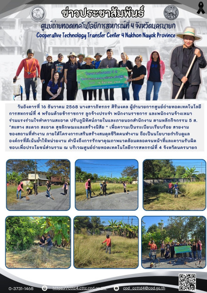 วันอังคารที่ 16 ธันวาคม 2568 นางสาวภัทรภร ศิริมงคล ผู้อำนวยการศูนย์ถ่ายทอดเทคโนโลยีการสหกรณ์ที่ 4 พร้อมด้วยข้าราชการ ลูกจ้างประจำ พนักงานราชการ และพนักงานจ้างเหมา ร่วมแรงร่วมใจทำความสะอาด ปรับภูมิทัศน์ภายในและภายนอกสำนักงาน ตามหลักกิจกรรม 5 ส. "สะสาง สะดวก สะอาด สุขลักษณะและสร้างนิสัย “ เพื่อความเป็นระเบียบเรียบร้อย สวยงาม ของสถานที่ทำงาน ภายใต้โครงการเสริมสร้างสมดุลชีวิตคนทำงาน ถือเป็นนโยบายกำกับดูแล องค์กรที่ดีเน้นย้ำให้หน่วยงาน คำนึงถึงการรักษาคุณภาพแวดล้อมตลอดจนหน้าที่และความรับผิดชอบเพื่อประโยชน์ส่วนรวม ณ บริเวณศูนย์ถ่ายทอดเทคโนโลยีการสหกรณ์ที่ 4 จังหวัดนครนายก