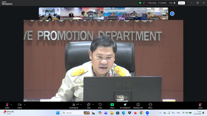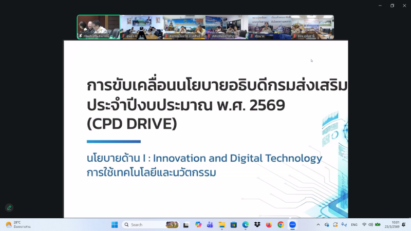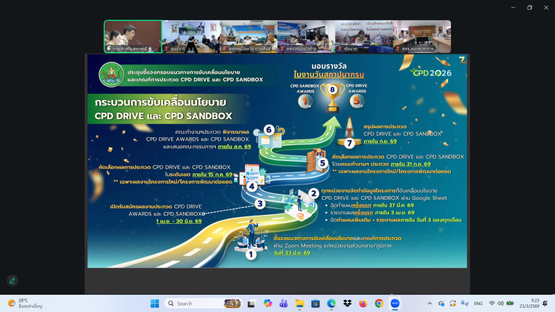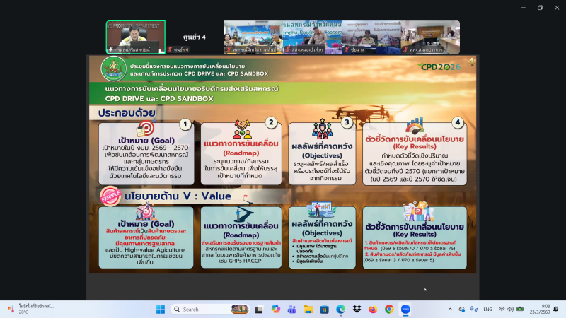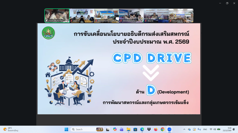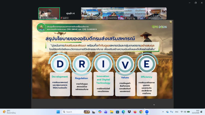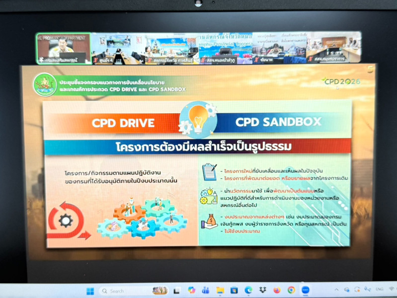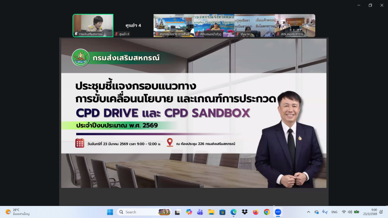 วันจันทร์ที่ 23 มีนาคม 2569 นางสาวภัทรภร ศิริมงคล ผู้อำนวยการศูนย์ถ่ายทอดเทคโนโลยีการสหกรณ์ที่ 4 พร้อมด้วยบุคลากรศูนย์ฯ 4 เข้าร่วมประชุมชี้แจงกรอบแนวทาง การขับเคลื่อนนโยบาย และเกณฑ์การประกวด CPD DRIVE และ CPD SANDBOX ประจำปีงบประมาณ พ.ศ. 2569 โดยมีนายณฤทธิ์ บุญชัย รองอธิบดีกรมส่งเสริมสหกรณ์ เป็นประธานในการประชุมฯ วัตถุประสงค์พื่อให้หน่วยงานส่วนกลางและส่วนภูมิภาคทราบและขับเคลือนนโยบายให้เป็นไปอย่างมีประสิทธิภาพ เกิดผลเป็นรูปธรรม รวมถึงบรรลุเป้าหมาย ที่กำหนดไว้ ผ่านระบบ Zoom Meeting